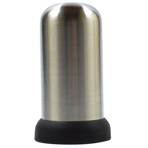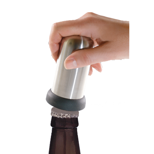 Cap-Popper Bottle Opener, 2" dia. x 4-1/4"H, push down, rubber rim base, stainless steel, brushed finish (factory box)