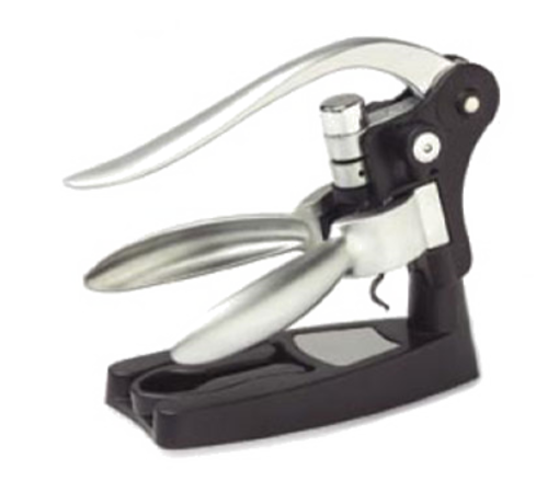 De-Corker Set, includes: (1) 7-1/2" x 6" de-corker, (1) foil cutter, (1) table stand, (1) replacement spiral, die cast handles, Made in Italy (retail box)