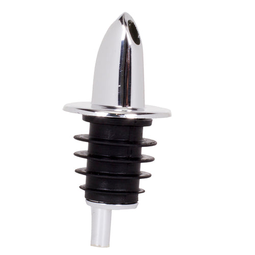 Liquor Bottle Pourer, 3" long, fast speed, with black collar & plastic cork, chrome plastic (premium carded)