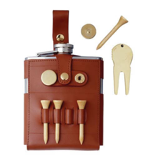 Golf Travel Flask, 8 oz., 4"W x 5-1/2"H, captive-top, (2) snap-off brass markers, (4) golf tees, (1) brass golf pitch fork and (1) tan leather case with belt loop & case strap, stainless steel (factory box)