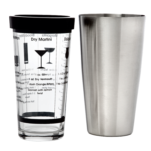 Boston Shaker Set, 2-piece, includes: (1) 25 oz., 3-1/2" dia. x 6-1/4"H stainless steel shell and (1) 3-1/4" dia. x 6-1/4"H recipe glass, with rubber gasket and (5) recipes & measurement indications (up to 15 oz.) (retail box)