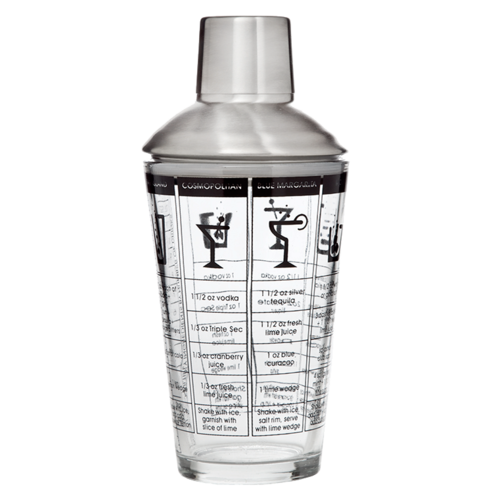 Cocktail Shaker Set, 3-piece, includes: (1) 16 oz., 3-1/2" dia. x 8-1/4"H glass shaker shell, (1) brushed stainless steel strainer, with beaded seal and (1) top cap, with (7) recipes & measurement indications (in oz. and ml) (retail box)