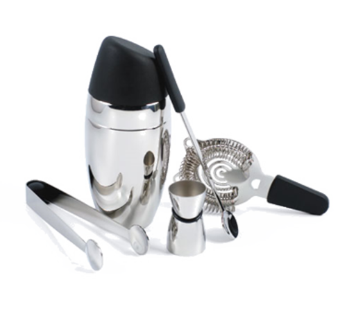 Barman's Deluxe Cocktail Shaker Set, 5-piece, includes: (1) 18 oz., cocktail shaker set, (1) cocktail strainer, (1) double jigger (1 oz., 1/2 oz.), (1) ice tongs and (1) bar spoon, rubberized soft grip on shaker top, strainer & bar spoon handles, stainless steel (retail box)