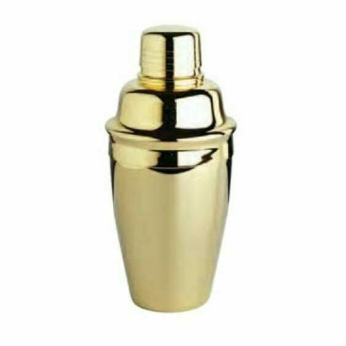 Tavern Cocktail Shaker Set, 3-piece, includes: (1) 8 oz., 2-5/8" dia. x 5-7/8"H, round shaker, (1) strainer and (1) jigger cap, stainless steel interior, gold plated exterior (retail box)
