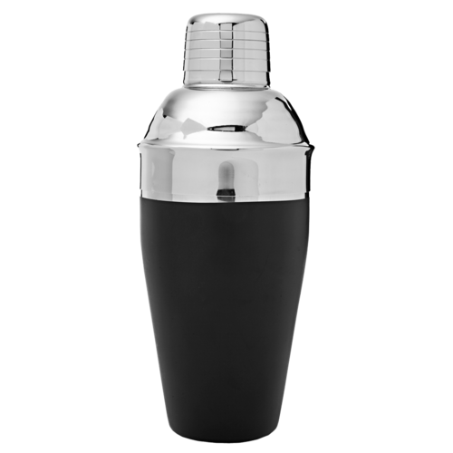 Tavern Soft Grip Cocktail Shaker Set, 3-piece, includes: (1) 18 oz., 3-1/2" dia. x 7-7/8"H, round shaker, (1) strainer and (1) jigger cap, stainless steel, slip-free rubberized exterior, black (retail box)