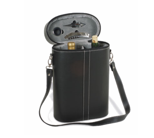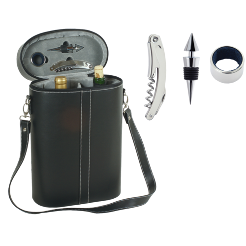 Wine/Champagne Travel Case Set, (2) bottle capacity, 8-1/2"W x 4"D x 14"H, zipper top with handle, shoulder strap, padded partitioned compartment, includes: curved stainless steel corkscrew, cone-top wine stopper & stainless steel drip collar, leatherette, black (factory box)