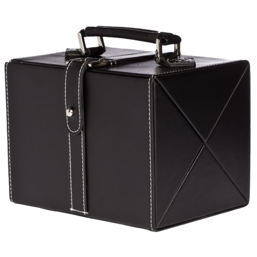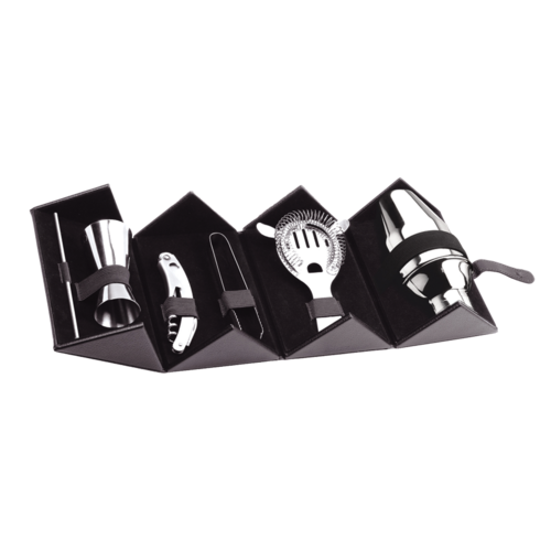 Cocktail Bar Travel Set, stainless steel, secured with black straps, includes: (1) 8 oz. three-piece cocktail shaker, (1) 1 oz. & 2 oz. double jigger, (1) curved corkscrew with bottle opener, (1) stirrer, (1) cocktail strainer, (1) ice tong, (1) 6-1/2"W x 2-3/4"D x 6-1/2"H luggage style leatherette case, black (factory box)