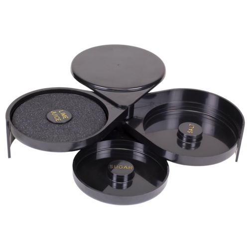 Glass Rimmer, 3-tier, 9-1/4" dia. x 2-7/8"H, round, collapsible & stacked, labeled lime juice/salt/sugar, with sponge, plastic, black (factory box)