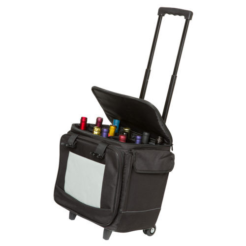 Wine/Champagne Travel Tote, (12) bottle capacity, 14-3/4"W x 11-1/2"D x 16-3/4"H, insulated, carry handle, adjustable shoulder strap, two-way locking zipper, removable 12-bottle separator inset, (2) side pockets, with hook and loop flap closures, (1) light gray front pouch, with added small pouches, double track rear rubber wheels, telescopic aluminum 2-step handle with push button, nylon, black (factory box)