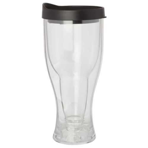 Party Goer's Beer Tumbler Glass, 17 oz., 3-7/16" dia. x 7-7/8"H, round, double wall sipper, stout shaped glass inside, with slide-top black lid, hand wash, BPA free, acrylic, clear (bulk pack)