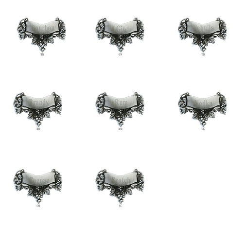 Decanter Label Tag, 2-7/8”W x 1-5/8”H, 5”L chain, engraved liquor names, zinc alloy, pewter finish (specify liquor name)