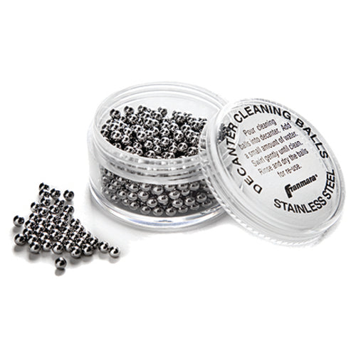Decanter Cleaning Balls, super fine size, 3mm, includes 1-5/8" dia. plastic container, reusable, stainless steel (500 balls per pack) (carded)