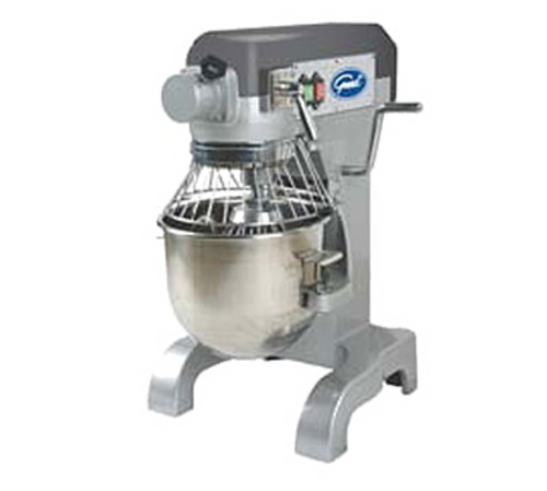 Commercial Planetary Mixer, 10 qt., 3 pre-selected fixed speeds (91/200/330 rpm), #12 taper hub, heat treated carbon steel gears fully sealed, overload switch, manual bowl lift, includes: stainless steel bowl, bowl guard with magnetic lock, spiral dough hook, flat batter beater & wire whip, 1/2 HP, 15 amps, cETLus, CE