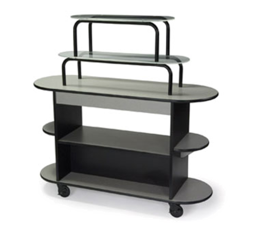 Dessert Cart, rounded oval, 55"W x 20"D x 54"H, (3) open shelves with 2 acrylic overshelves, open side shelves, high impact edge molding, 1-1/2" steel tube legs, 4" swivel casters, Made in USA (by Lakeside)