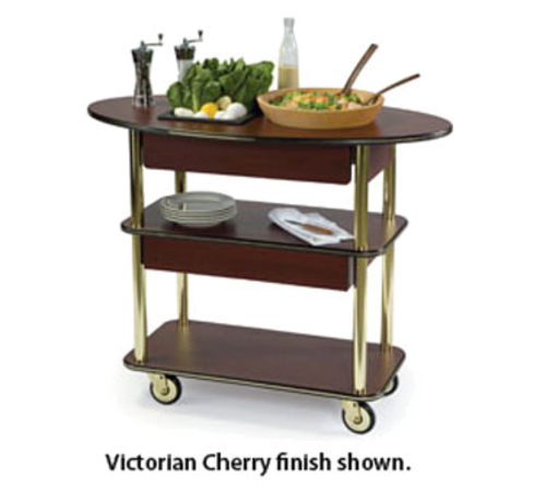 Salad Cart, rounded oval top, rectangular under shelves, 44"W x 23"D x 35"H, (3) open shelves, cutouts for salad bowl & pan (not included), pullout drawer, high impact edge molding, 1-1/2" steel tube legs, 4" swivel casters, Made in USA (by Lakeside)