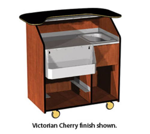 Portable Bar, 44-1/4"W x 33"D x 43-1/2"H, wood laminate construction with stainless steel shelf, (1) 40-lb capacity ice bin, (1) removable 7-bottle speed rail, adjustable shelves, high impact edge molding, waterproof black laminate top, 4" swivel casters, Made in USA (by Lakeside)