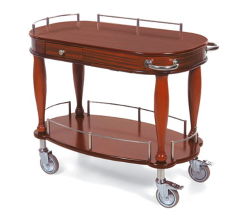 Serving Cart-Bordeaux, 39-3/8"W x 21-5/8"D x 34-5/8"H, drawer, pull-out shelf on end, side handles, oval shaped top, (1) shelf, solid beech wood legs, stained & varnished, 304 stainless handles and rails, wood veneer overlay construction with satin varnish finish, 5" plastic core wheel with non-marking bonded rubber exterior (2 with brakes) (by Lakeside)