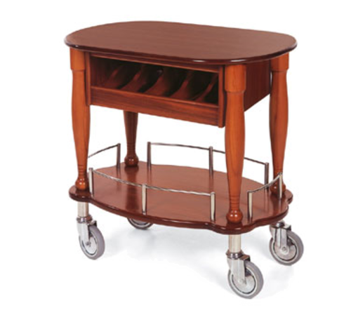 Gueridon Cart-Bordeaux, 35-1/2"W x 17-3/4"D x 29"H, oval shaped top, cutlery compartment, (1) shelf, solid beech wood legs, stained & varnished, 304 stainless rails, wood veneer overlay construction with satin varnish finish, 5" plastic core wheel with non-marking bonded rubber exterior (2 with brakes) (by Lakeside)