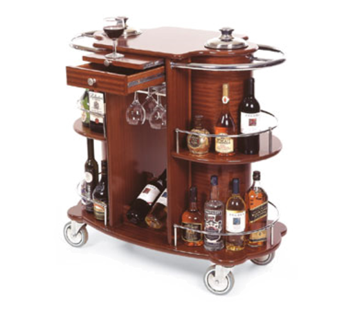 Wine/Liquor Cart-Bordeaux, 39-3/8"W x 19-5/8"D x 40-1/2"H, (2) recessed ice buckets, acrylic glass rack, pull-out shelf, drawer, removable bottle caddy, oval shaped top, (2) shelves, 304 stainless handles and rails, wood veneer overlay construction with satin varnish finish, 5" plastic core wheel with non-marking rubber exterior (2 with brakes) (by Lakeside)