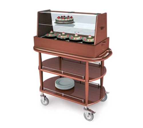 Pastry Cart-Spice, 43-3/8"W x 21-5/8"D x 53-1/2"H, acrylic hinged top dome, middle shelf in dome, cooling well, stainless surface, square top with cut-out handles, (2) oval shelves, removable middle shelf, 304 stainless rails, wood veneer overlay construction with satin varnish finish, 5" chrome wheel tops, plastic core wheel with bonded rubber exterior (2 with brakes) (by Lakeside)