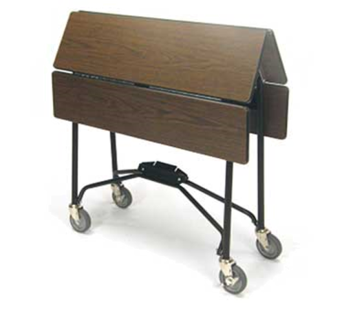 Space-Saver Series Room Service Table, square, 36"W x 36"D x 30"H, (folding frame and top for compact storage 36"W x 14"D x 37"H), spring arm leaf supports with piano hinges, mahogany woodgrain laminate top, powder coat black frame, 4" casters (2 with brakes), Made in USA