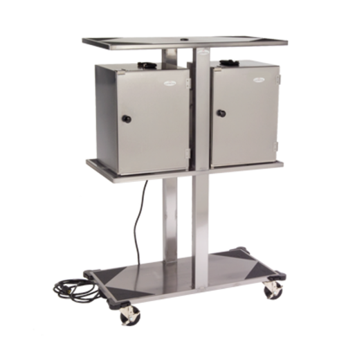 Food Carrier Box Rack, holds (6) electrical food carrier boxes, flat shelves with non-slip pads, 18 gauge reinforced shelves, welded stainless steel construction, galvanized steel dolly with 4" swivel casters (2 with brakes), frame-mounted plug strip with six receptacles for 15A plugs, 15' power cord, NEMA 5-20P, Made in USA