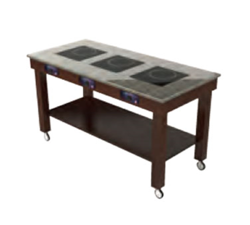 Induction Cart, 60"W x 27"D x 36"H, rectangular shaped top, (1) shelf, chippendale style 3" x 3" legs, wood veneer overlay, solid surface top, (3) 650 watt induction warmers, 5" casters (2 with brakes), Made in USA (by Lakeside)