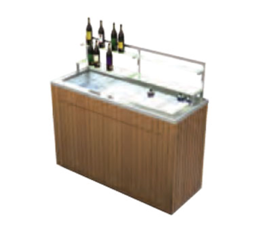 Chalet Portable Back Bar, 72"W x 30"D x 58"H, stainless steel interior, IPE wood exterior, solid surface top, (3) lower compartment doors, 5" casters (4 swivel, 2 lock), Made in USA (by Lakeside)