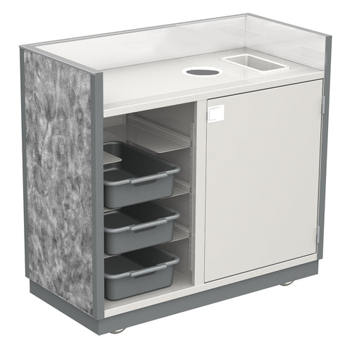 Mobile Bussing Station, 49"W x 28"D x 46-1/4"H, liquid and solid waste storage, (1) enclosed compartment and (1) bus tub compartment with adjustable tub ledges, stainless steel construction and laminate exterior, Made in USA