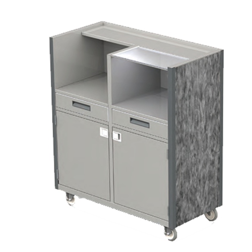 Mobile Setup Station, 48"W x 23"D x 55" O.A., (2) open compartment on top & (2) enclosed compartments on bottom with (3) sets each of adjustable universal ledges (1" increments), (2) utility drawers, upper right compartment includes for a computer terminal & clear plexiglas top shield, stainless steel construction with 20 gauge sides & 18 gauge top, hinged doors with recessed paddle latch, laminate exterior finish, (4) recessed/hidden 5" all-swivel cushion casters fastened to stainless steel dolly frame, Made in USA (contact factory for price)