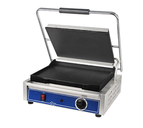 Sandwich Grill, 14"x10", seasoned cast iron smooth griddle plates, stainless steel construction, on/off switch, heavy-duty hinge, adjustable stainless steel non-skid feet, catch tray, 120v/60/1-ph, 1800 watts, 15.0 amps, NEMA 5-15P, 4 ft. power cord, NSF, cULus