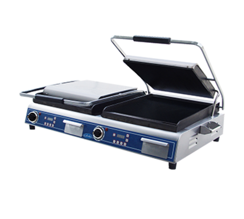 Sandwich/Panini Grill, double, countertop, electric, cast iron smooth plates, (2) 14" grills, electronic timer with (4) programmable presets, temperature control to 570°, spring hinge with adjustable tension, stainless steel removable catch tray, rubber feet, stainless steel construction, 208-240v/60/1-ph, 5400/7200 watts, NEMA L6-30P, 4 ft. power cord, NSF, cULus