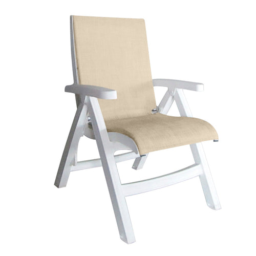 Jamaica Beach Midback Folding Chair, stackable, designed for outdoor use, sling, white frame, power washable, UV resistant, recyclable, straw, Made in USA