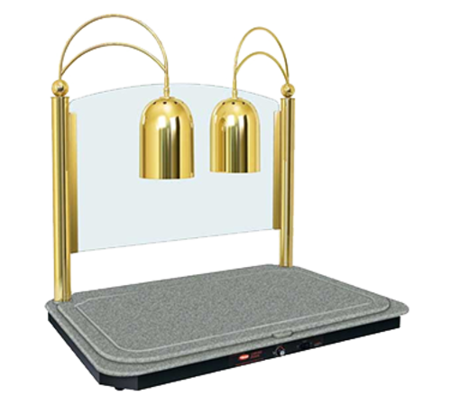 Decorative Carving Station with Two Heat Lamps (clear bulbs included), telescoping clearance (bottom of shade to top of cutting board) 14" - 26", 30° shade pivot, heated Swanstone® base with thermostatic control, includes one 36"x24" cutting board with meat juice containment, specify finish, CE, cULus, UL EPH Classified, Made in USA