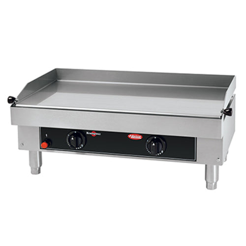 (QUICK SHIP MODEL) Hatco®/Krampouz® Griddle, natural gas, countertop, 25"W x 13"D cooking surface, (2) independent thermostatically controlled cooking zones, (2) U-shaped burners, battery powered electronic ignition button, heat-actived safety thermocouple, removable drip tray, stainless steel frame & griddle plate, 13,648 BTU/HR, cETLus, ETL-Sanitation (ships with propane conversion components, pressure regulator & gas shut-off valve)