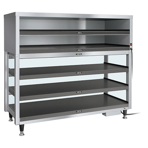 Product Heated Shelves, electric, bottom triple shelf unit, (9) 18" diameter pizza capacity, on/off switch controls all shelves, open front & back with glass side panels, with base & overhead heat, LED lights, cord on server side, bottom right on base, stainless steel construction, 2-1/2" legs, 4100 watts