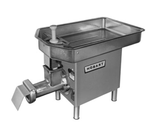 Hobart Meat Grinder with fixed (non-removable) pan, #32 tinned chop end, 3 HP motor, geared transmission, 35-40 lb/min capacity, 34" x 21" x 4-15/16" stainless steel pan, grey epoxy housing finish, various legset options are available, UL, NSF