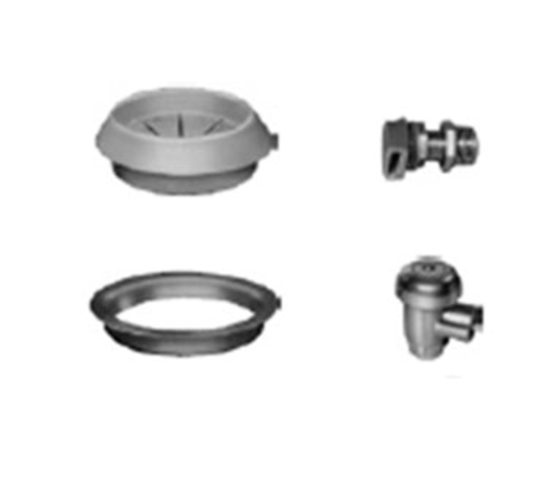 Disposer Accessory, GROUP D, includes: vinyl silver-saver splash guard ring, vacuum breaker, fixed direction water inlet for sink, 7" I.D. stainless steel weld-in adapter