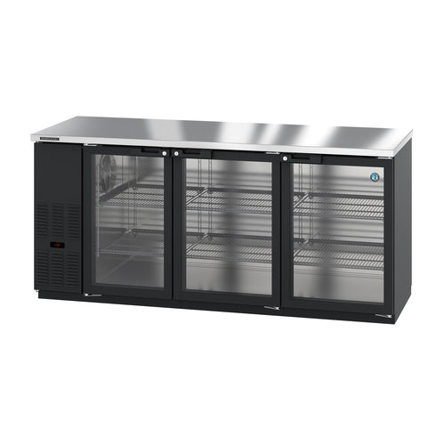 Refrigerated Back Bar Cooler, reach-in, three-section, side mount self-contained refrigeration, 80"W, 26.74 cu. ft. capacity, holds approximately (1092) 12 oz. cans or (4) 1/2 Kegs, (3) hinged glass doors (locking), (6) adjustable shelves, LED interior lighting, 18 gauge stainless steel top, stainless steel interior, black vinyl-coated exterior front sides & rear, R290 Hydrocarbon refrigerant, 1/3 HP, 115v/60/1-ph, 2.5 amps, cord, NEMA 5-15P, cETLus, ETL-Sanitation