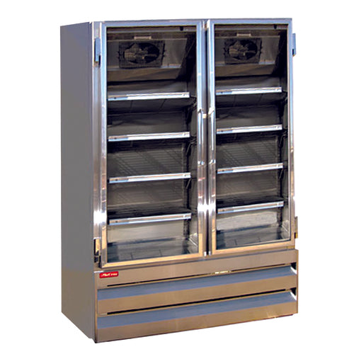 Refrigerator Merchandiser, two-section, 48 cu. ft. capacity, bottom mount self-contained refrigeration, (2) hinged glass doors, (4) epoxy coated shelves per door, LED lighting, white exterior & interior, 1/3 HP, 115v/60/1-ph, 11.0 amps, cord, NEMA 5-15P, cULus, UL EPH Classified, UL-Sanitation