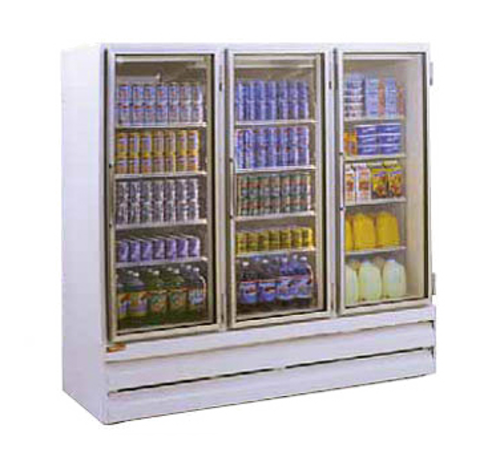 Refrigerator Merchandiser, three-section, 75 cu. ft. capacity, bottom self-contained refrigeration, (3) sliding glass doors, (4) epoxy coated shelves per door, electronic control, LED lighting, white exterior & interior, 1/2 HP, 115v/60/1-ph, 13.0 amps, cord, NEMA 5-20P, cULus, UL EPH Classified, UL-Sanitation