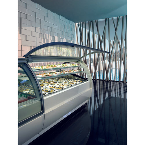 Koreia Gelato Display Case/Showcase, 85.43"W, holds (16) 12 liter pans, air cooled self-contained refrigeration, tempered double pane heated glass front & sides, hydraulic lift up front glass, rear plexiglass sliding doors, digital diagnostic control with programmable defrosting, removable stainless steel deck, 304 stainless steel back & interior, silver anodized aluminum trim, gelato pans sold separately, showcase comes with factory standard, matte white front & side panels, 220v/60/1-ph, 16.0 amps, (2) 1 HP units