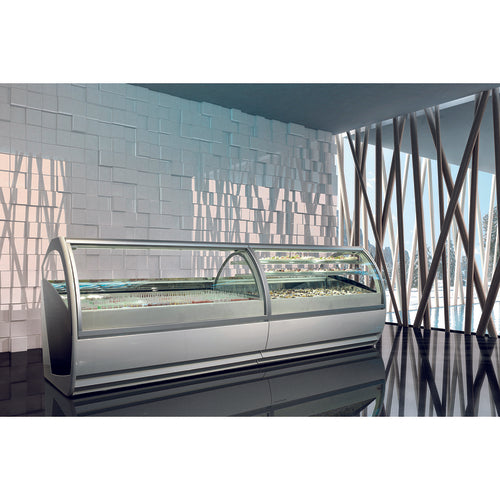 Koreia Chocolate Display Case/Showcase, 44.09"W, air cooled refrigeration, self-contained, tempered double pane glass front & sides, hydraulic lift up front glass, rear plexiglass sliding doors, (1) shelf (non-refrigerated), digital humidity control on refrigerated deck only, digital diagnostic control with programmable defrosting, 304 stainless steel interior, silver anodized aluminum finish, matte white front & side panels, 220v/60/1-ph, 10.0 amps, 1/3 HP