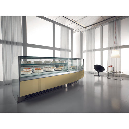 KT24 Curved Neutral Display Case/Showcase, non-refrigerated, 57.56"W customer side & 23.07"W on server side, tempered double pane glass front & sides, tilt back front glass, incline display, clear plexiglass top support structure, rear plexiglass sliding doors, (1) shelf, LED lighting, removable stainless steel deck, 304 high gloss stainless steel interior, silver anodized aluminum trim, 45° corner display/showcase, matte white front & side panels, 115v/60/1-ph, 2.0 amps
