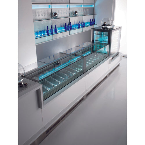 24h La Rossa Gelato/Ice Cream Display Case/Showcase, 39.36" length without panels, holds (7) 5 liter pans, with reserve pan storage, insulated, self-contained, air cooled refrigeration, tempered single pane heated glass front & double pane glass sides, hydraulic lift up top glass, LED lighting, rear plexiglass sliding doors, digital diagnostic control with programmable defrosting, removable stainless steel deck, 304 high gloss stainless steel interior, anodized aluminum construction, stainless steel work surface, gelato pans sold separately, service merchandiser, cooler, dipping cabinet, showcase without front & side panels 220v/60/1-ph, 12.0 amps