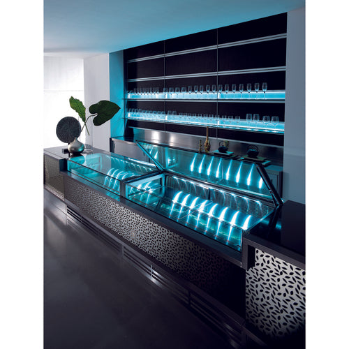24h La Rossa Neutral Display Case/Showcase, non-refrigerated, 78.73" length without panels, tempered single pane glass on front & double pane glass sides, LED lighting, hydraulic lift up top glass, rear plexiglass sliding doors, (2) shelves, 304 high gloss stainless steel interior, anodized aluminum construction, stainless steel work surface, service merchandiser, ambient, dry, showcase without front & side panels 220v/60/1-ph, 6.0 amps
