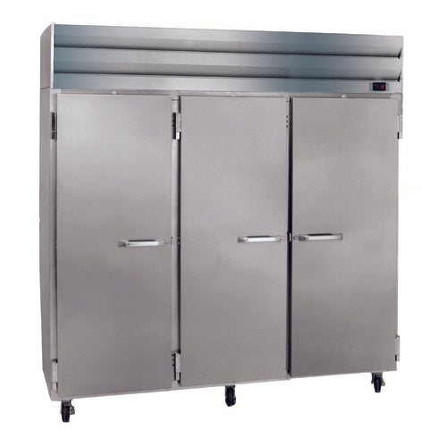 Freezer, reach-in, three-section, remote refrigeration, R448A expansion valve & XR40 Dixell Control provided, (3) solid hinged stainless steel doors, adjustable shelves, dial thermometer, stainless steel front, aluminum interior & outside ends, 5" casters, 115/208-230v/60/1-ph, 8.5 amps, 3,900 BTU (does not include condensing units or other hook ups), cULus, UL EPH Classified ,UL-Sanitation