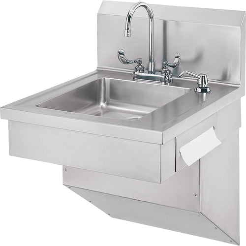 ADA-WS Handicap Hand Sink, wall mounted, 22"W x 24"D x 31-7/8"H overall size, deck mount holes with 4" centers, includes gooseneck faucet with wrist-action handles, 10"H backsplash, 14"W x 16" front-to-back x 4" deep bowl, non-drip marine edges, soap & towel dispensers, front apron with rear flange & "Z" strip, 16/304 stainless steel construction, ADA Compliant, NSF, Made in USA