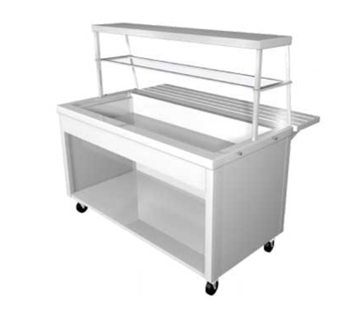 Cold Food Counter with Ice Pan, (3) pans, 50"W x 30-1/2"D x 36"H, ice pan 6" deep, coved corner stainless steel insulated construction, pitched to 3/4" brass drain with shut off valve, removable stainless steel perforated false bottom, mobile modular, open cabinet base, 16 gauge stainless steel top, 14 gauge stainless steel frame, 5"H heavy duty double bearing swivel casters, (2) casters to be fitted with brakes