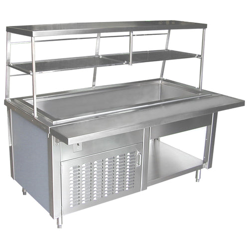 Cold Food Counter with Refrigerated Cold Pan, self-contained, (6) pans, 92"W x 30-1/2"D x 36"H, holds cold food between 33° - 41°F, white bottom display for crocks, pans, etc., mobile modular, open cabinet base, 16 gauge stainless steel top, 14 gauge stainless steel frame, 5"H heavy duty double bearing swivel casters, (2) casters to be fitted with brakes, 6' cord & plug, 1/4 HP, 120v, 7.0amps, 5-15P, UL, NSF 7